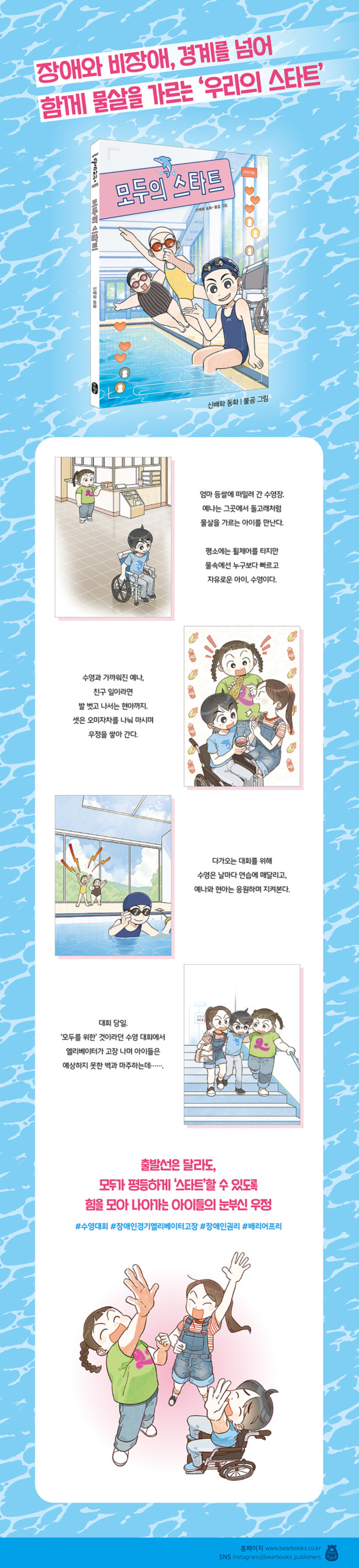 책읽는곰 ‘큰곰자리 중학년’ 시리즈 다섯 번째 동화 《모두의 스타트》가 출간되었습니다. 이 작품은 수영장을 배경으로, 장애 아동이 일상에서 마주하는 편견과 물리적 문턱을 아이들 시선으로 보여 줍니다.