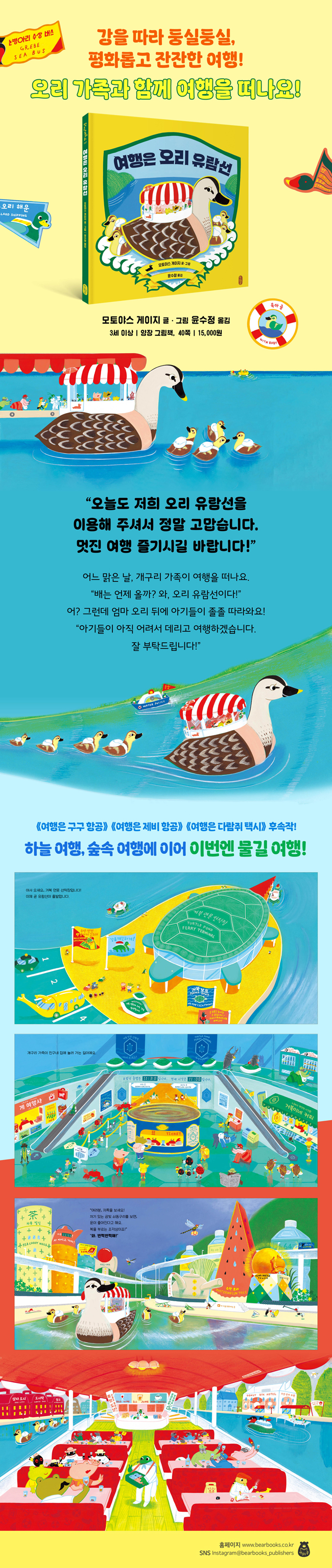 어느 맑은 날, 개구리네 가족이 ‘거북 연못 선착장’에 도착했습니다. 배를 타고 둥실둥실, 강 건너 친구네 집에 놀러 가는 길입니다. 신이 난 꼬마 개구리가 창밖을 내다보다가 소리를 지릅니다. “오리 유람선이야!” 오리 가족이 부드럽게 물결을 가르며 선착장으로 들어옵니다. 엄마 오리 등에는 유람선이 실려 있습니다. “지금부터 배에 올라타 주시기 바랍니다. 아기들이 아직 어려서 데리고 여행하겠습니다. 잘 부탁드립니다!”