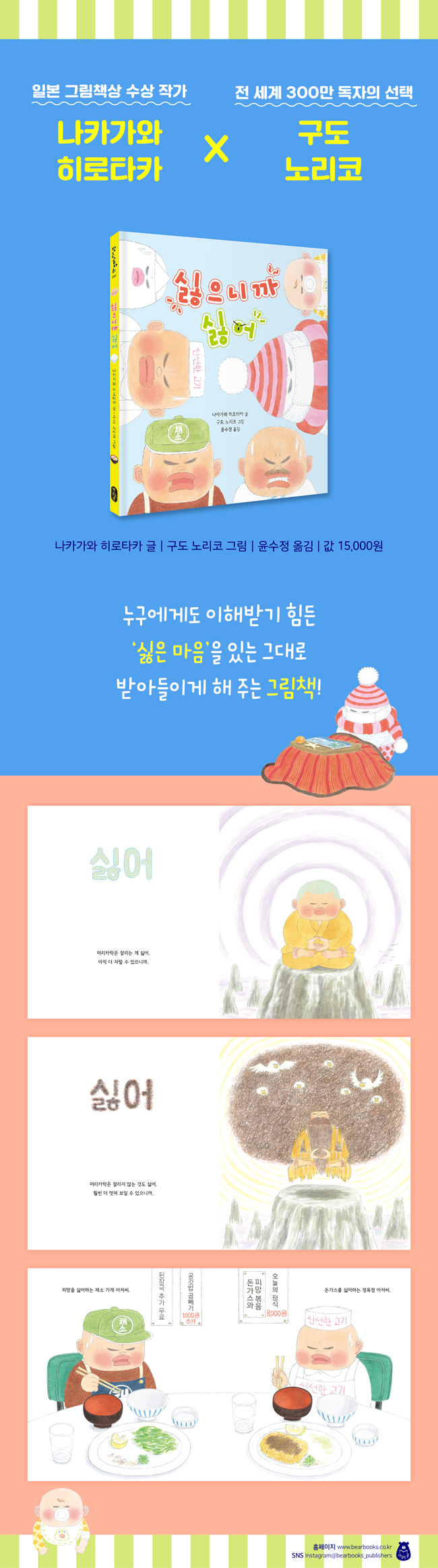 그럼에도 어린이에게 ‘싫어’로 가득한 그림책을 보여 주는 것이 주저된다면 마지막 장을 펼쳐보자. “싫어, 싫어. 싫은 것도 싫어. 싫다고 하는 것도 싫어. 싫으냐고 묻는 것도 싫어.” 글은 폭풍처럼 불평을 쏟아내고 있지만, 그림은 다른 이야기를 한다(어떤 이야기를 하고 있는지는 직접 확인해 보시길). 나아가 글과 그림이 어우러지며 자신을 솔직하게 드러냄으로써 타인과 더 건강하게 연결될 가능성을 시사한다. 300권 가까운 그림책에 글을 쓰고 어린이를 위한 노래를 만들어 온 글 작가, 전 세계 300만 독자의 사랑을 한 몸에 받고 있는 그림 작가의 내공(?)을 믿어 보시라!